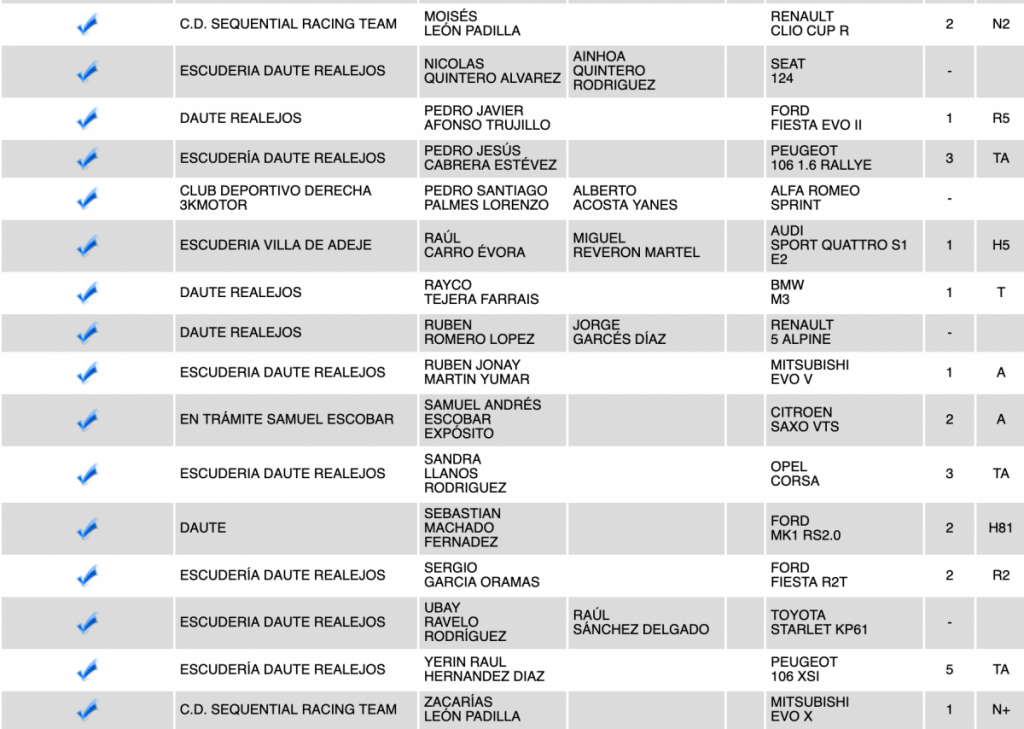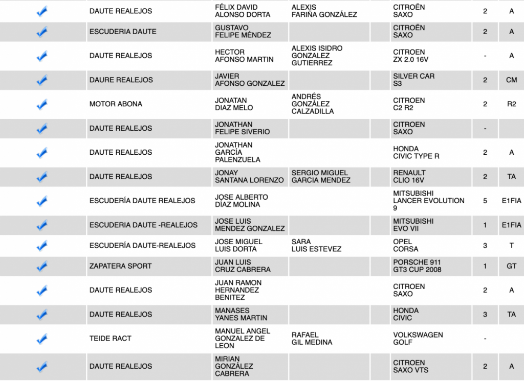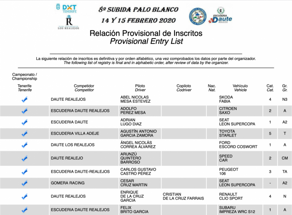Publicamos la relación provisional de inscritos de la VIII Subida a Palo Blanco (Tenerife), donde destacan el Subaru Impreza WRC de Félix Brito; el Ford Fiesta R5 de Pedro Javier Afonso; el Porsche 911 GR3 de Juan Luis Cruz; el Ford Escort Cosworth de Nicolás Correa, el Mitsubishi Lancer Evo IX de José Alberto Díaz, el Evo VII de José Luis Méndez, el Evo V de Rubén Jonay Martín, el Evo IX de Zacarías León; el Seat León SuperCopa de César Cruz y Adrián Lugo; el Honda Civic Type R de Jonathan García Palenzuela; el Audi Sport Quattro S1 E2 de Raúl Carro y la Silver Car S3 Javier Afonso como lo más destacado.
