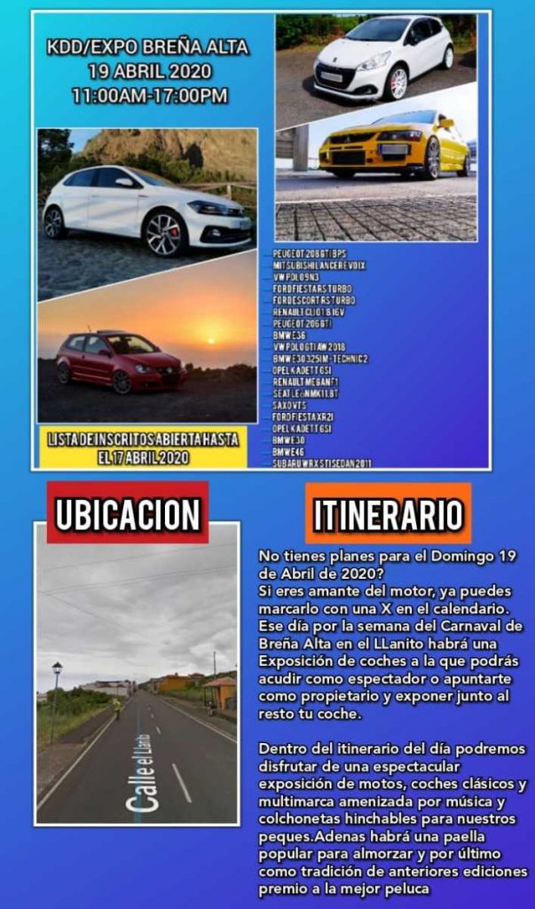 El próximo 19 de abril de 2020, en la isla de La Palma, se celebrará Expo Breña Alta de 11:00 hasta las 17:00 horas. Las inscripciones se pueden efectuar en el número 680 102 718 (whatsapp).
