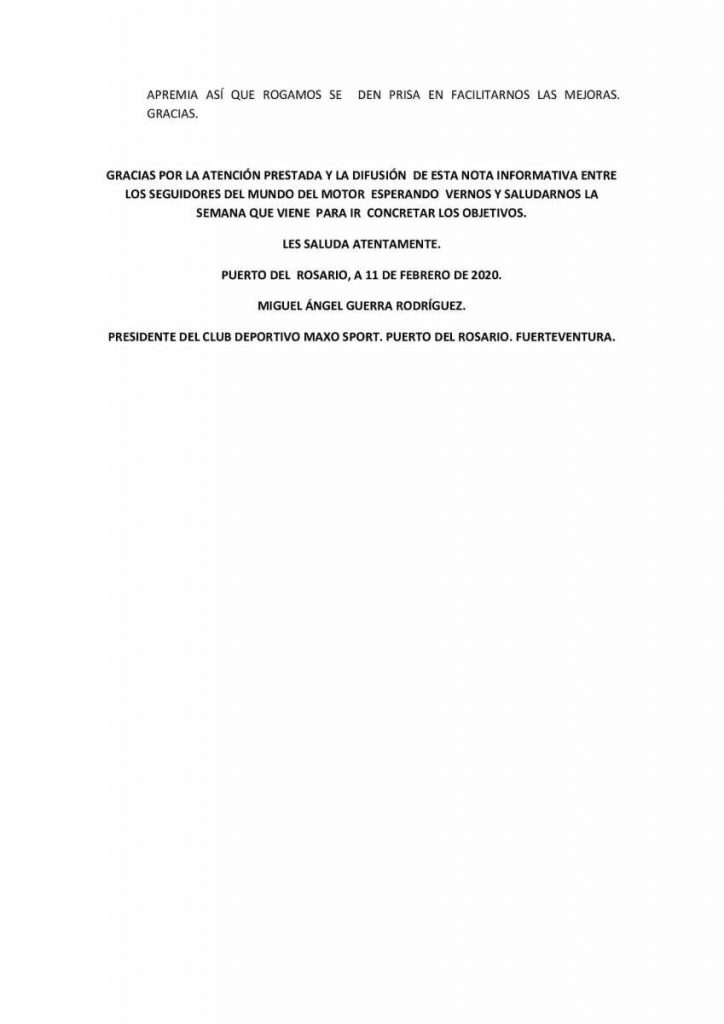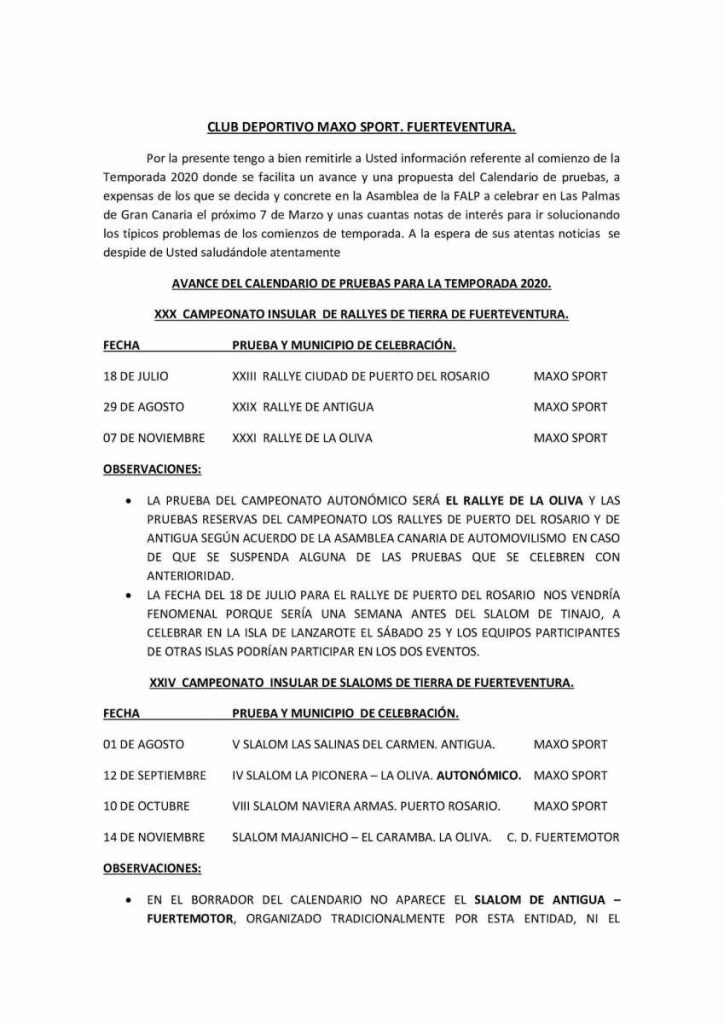 El Club Deportivo Maxo Sport ha publicado su propuesta de calendario de pruebas del Campeonato Insular de Rallys de Tierra de la isla de Fuerteventura, quedando todo a expensas de lo que se concrete en la Asamblea de la Federación de Automovilismo de Las Palmas.