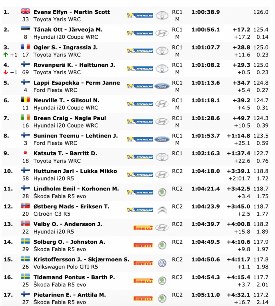 Lappi y Ferm (Ford Fiesta WRC) siguen quintos a solo 5.4 del cuarto lugary a 5.9 del tercero, mientras que los ganadores en Monte-Carlo, Neuville y Gilsoul (Hyundai i20 Coupé WRC) son sextos a 4.5 del cuarto lugar.
