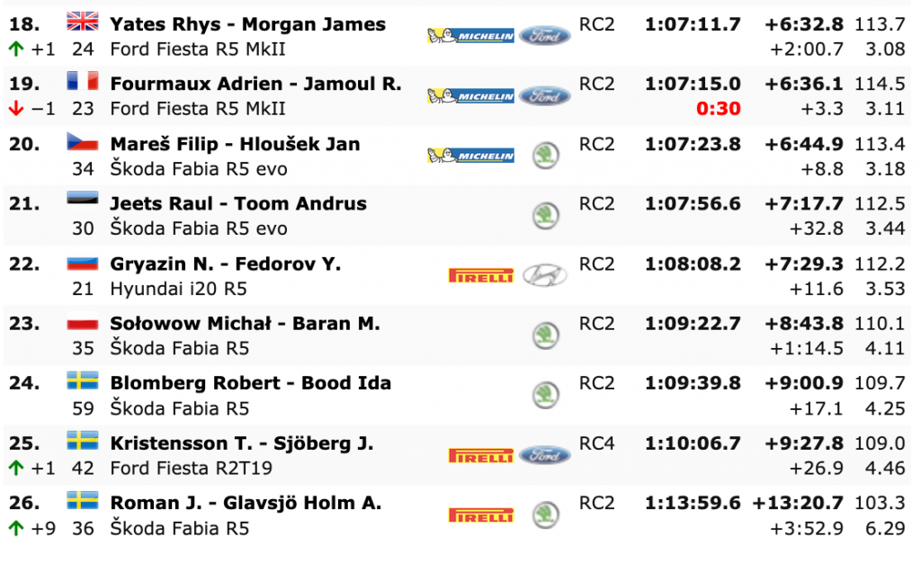 De lo poco novedoso en la parte alta es que los galos Ogier e Ingrassia (Toyota Yaris WRC) asaltaron el tercer lugar de la general al superar al final del día a sus compañeros Rovanperä y Halttunen (Toyota Yaris WRC),a los que ahora aventahan en solo 0.5.