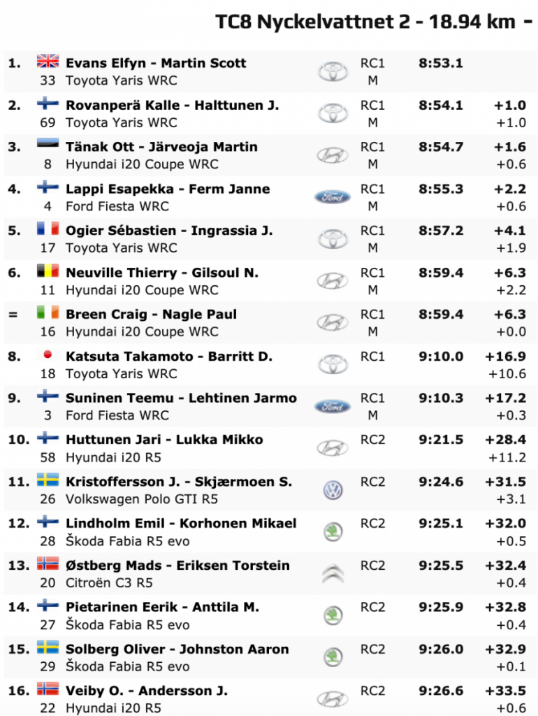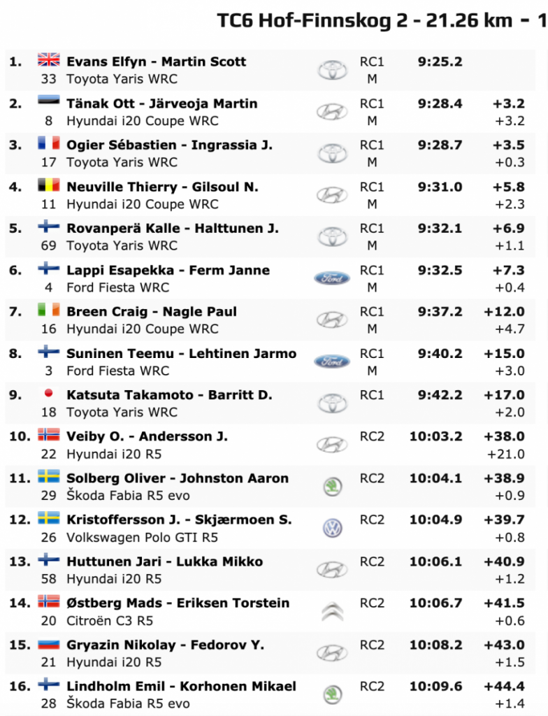 Los británicos se acostaron con una renta de 8.5 respecto a los estonios Ott Tänak y M. Järveoja (Hyundai i20 Coupé WRC), pero esa renta la han logrado ampliar hasta 16.9.