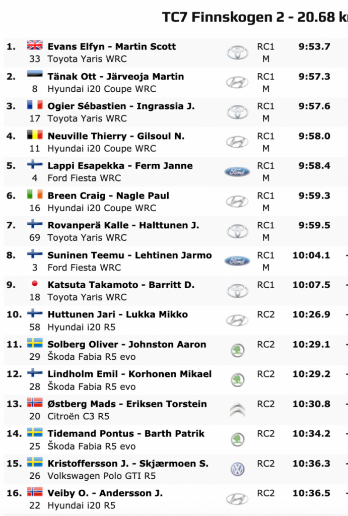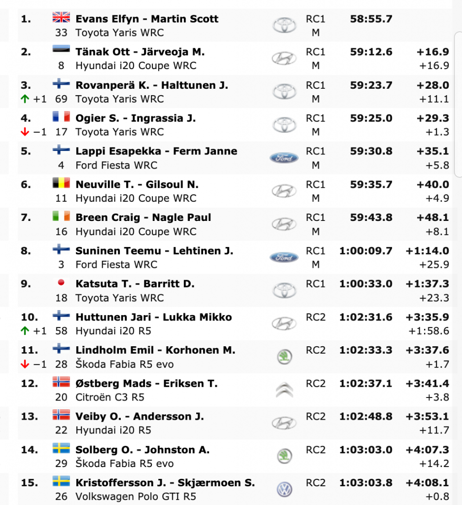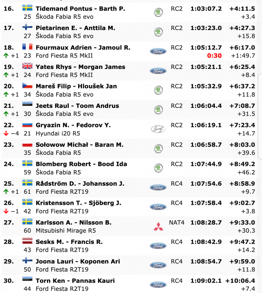 Terceros clasificados son K. Rovanperä y J. Halttunen (Toyota Yaris WRC), que están a +28.0 del liderato, seguidos de los galos Ogier e Ingrassia (Toyota Yaris WRC), cuartos, Lappi y Ferm (Ford Fiesta WRC) y Neuville y Gilsoul (Hyundai i20 Coupé WRC), los ganadores en Monte-Carlo.