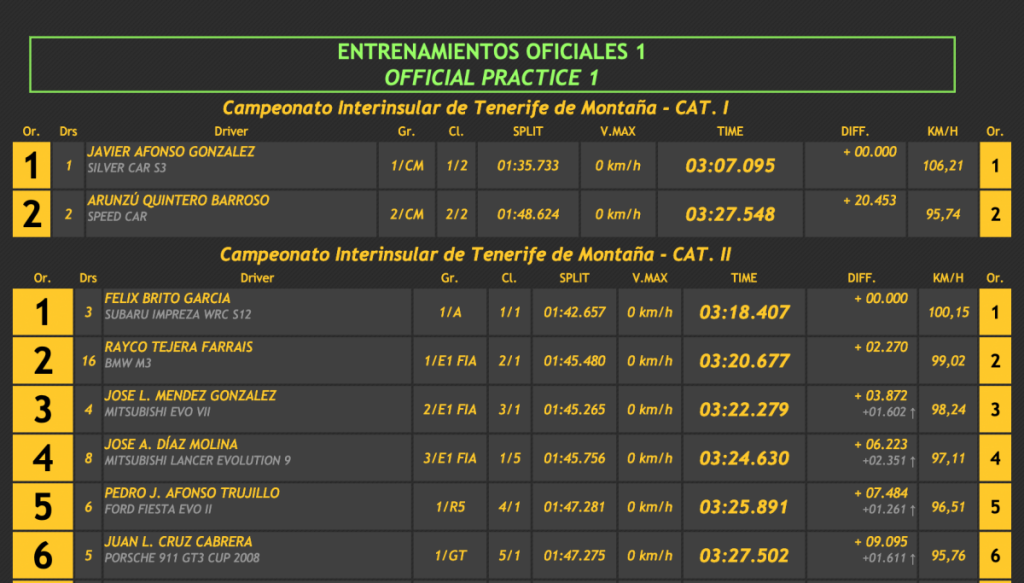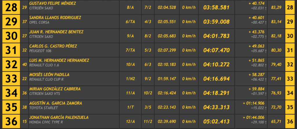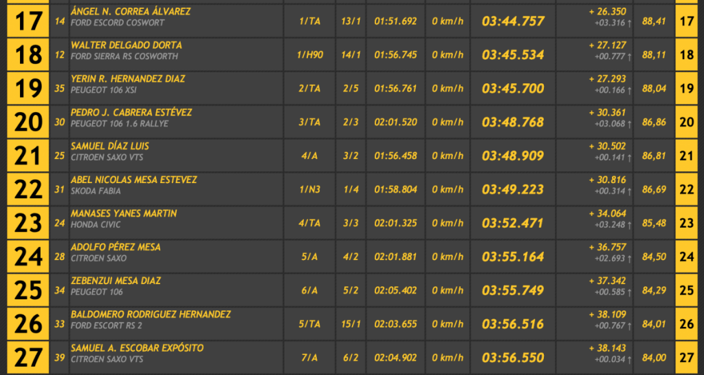 Félix marcó un crono de 3:18.407 para superar a un sorprendente Rayco Tejera (BMW M3), que se quedaba a 2.270. José Luis Méndez (Mitsubishi Lancer Evo VII) ha sido el tercero a 3.872, seguido de José Alberto ‘Berti’ Díaz (Mitsubishi Lancer Evo IX), Pedro Javier Afonso (Ford Fiesta R5 Evo II) y Juan Luis Cruz (Porsche 911 GT Cup 2008).