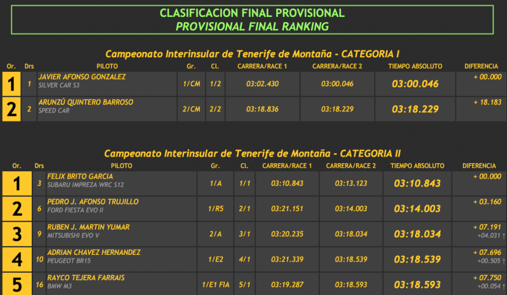 Félix no dejó margen a la improvisación y como hace un año, justo cuando debutaba con su Impreza WRC, imprimió un fuerte ritmo para un 3:10.843 inicial, el que le valdría para ganar, puesto que en la manga final empeoró su registro al para el reloj en 3:13.123. Quien sorprendió en la manga final fue Pedro Javier Afonso (Ford Fiesta R5 Evo II), que después de ser quinto en la primera cronometrada puso toda la carne en el asador para finalizar segundo a 3.160.