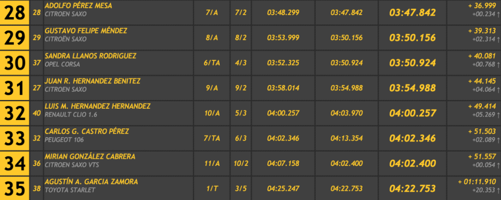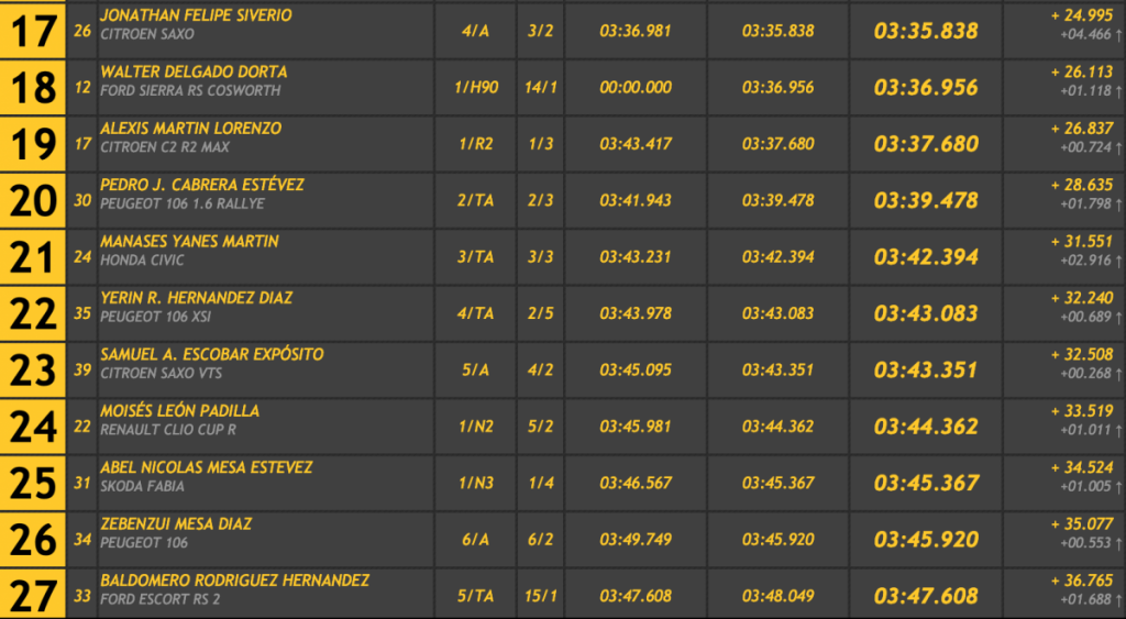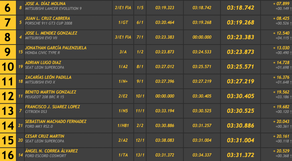 Después de ser segundo en el inicio, Rayco Tejera (BMW M3) caía a la quinta plaza, lo mismo que José Alberto ‘Berti’ Díaz (Mitsubishi Lancer Evo IX), que de ser tercero bajó al sexto lugar.