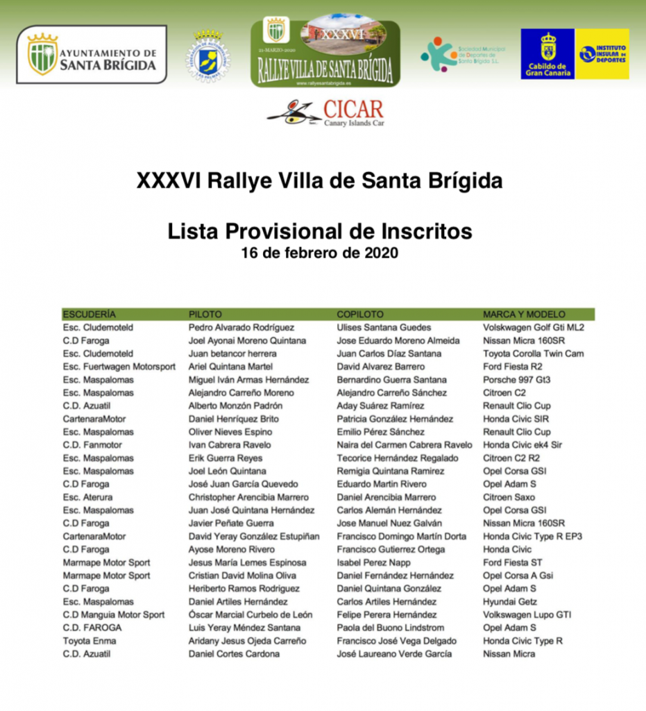 Inscritos provisional del Rally Villa de Santa Brígida al 16 de febrero Por Rafa León Última actualización: 18/02/2020 21:19 Compartir FacebookTwitterWhatsAppEmailTelegramLinkedin Publicamos los inscritos de manera provisional del Rally Villa de Santa Brígida al 16 de febrero. Campeonato de Las PalmasCanariasGran CanariaLas PalmasRally Villa de Santa Brígida.Santa Brígida Compartir