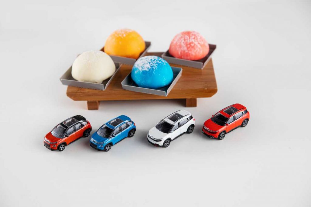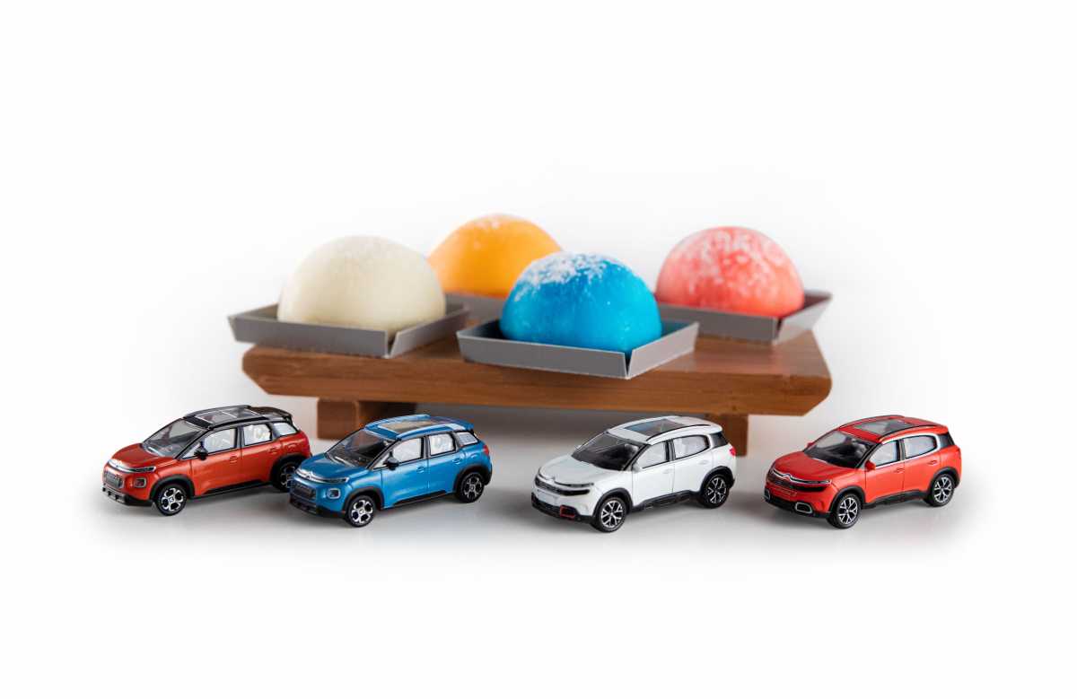 En cuanto al SUV Citroën C5 Aircross, su Rojo Volcano ha llevado a los reposteros de Niji a crear el Mochi de Sakura, relleno con una mousse aromática de flor de cerezo. Para los más golosos, el Mochi de Choco Blanco parte del Blanco Banquise para ofrecer una dulce mousse de chocolate blanco con virutas de este mismo dulce.