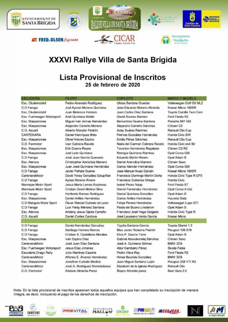 El XXXVI Rallye Villa de Santa Brígida agradece el apoyo de las siguientes instituciones y empresas privadas: Ayuntamiento de Santa Brígida, Sociedad Municipal de Deportes de Santa Brígida, Cabildo de Gran Canaria – Instituto Insular de Deportes, Ayuntamiento de Valsequillo, CICAR, DM Promaster Eventos, Atodomotor.com, Fred. Olsen Express, Provital, LTSE, Construc Ser & Ref, Nn Computers, NeProCan, Restauración Mallow, Mecajesa – Mecánica Industrial y Estación BP Santa Brígida.