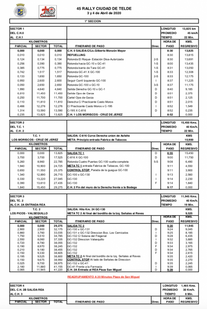 El Cludemoteld, con José Miguel Zerpa al frente, ha decidido, después de revisar y por el bien de los participantes, así como la seguridad de los mismos, para evitar unos enlaces apretados en tiempo y de este modo poder ir más holgados, se ha estimado oportuno cambiar el Itinerario Horario y con ello el rutómetro de la 45º edición del Rally Ciudad de Telde a celebrar los días 3 y 4 de abril.