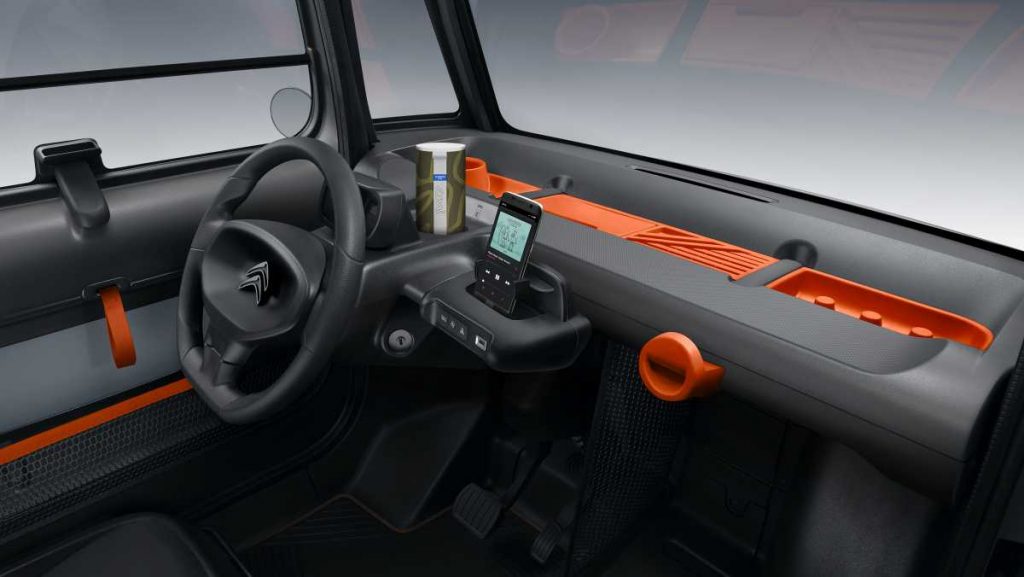 Audaz y a la moda, Ami – 100% ëlectric innova y propone, con la fórmula “Do It Yourself”, la posibilidad de crear un objeto al gusto de cada persona a partir de accesorios que fácilmente puede colocar unx mismx. En el kit se integran elementos de color funcionales: filete central de separación, filete de puerta, alfombrilla, espacio portaobjetos sobre el salpicadero, gancho para el bolso, pinza para el Smartphone y centralita DAT@MI conectada a la aplicación My Citroën para usar en el smartphone y que incluye todas las informaciones relacionadas con Ami. El interior se conjunta con el exterior mediante toques de color en los embellecedores de ruedas, los adhesivos en el montante o la cápsula de la parte inferior de la puerta. 4 ambientes principales: MY AMI GREY, MY AMI BLUE, MY AMI ORANGE, MY AMI KHAKI. Este kit de accesorios permite crear un universo propio e incrementar la funcionalidad.