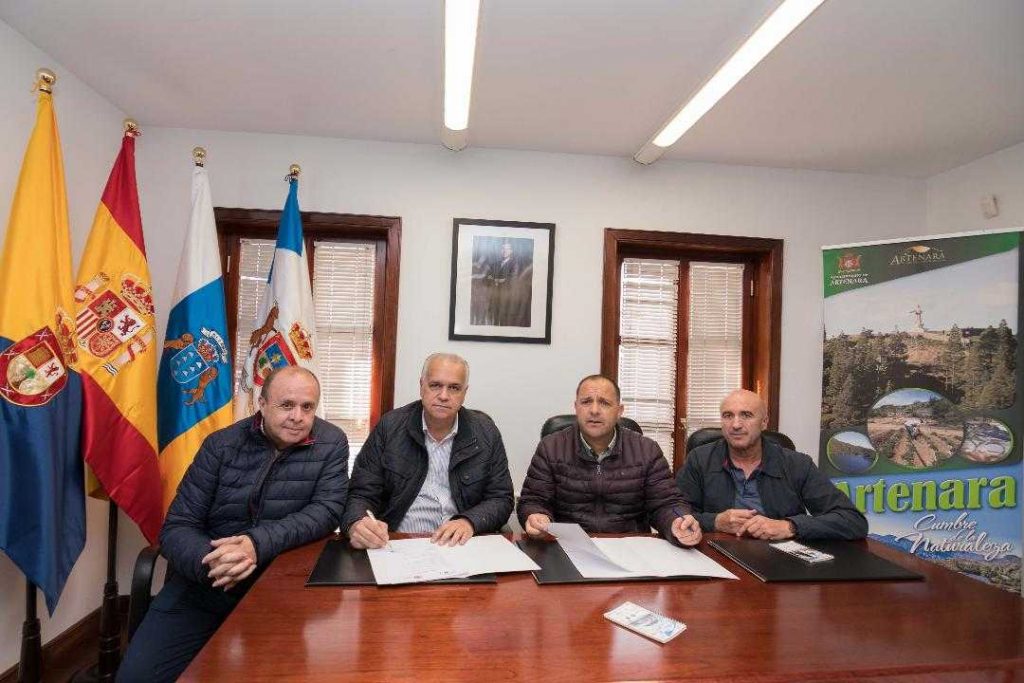 En la firma del acuerdo, celebrado en el Ayuntamiento de Artenara, Jesús Díaz y Germán Morales firmaron el acuerdo que les vincula para la edición 2020, en compañía de Alberto Díaz, concejal de Deportes, y de Miguel Espino, coordinador de seguridad del Rally Islas Canarias.