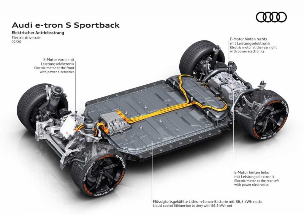 Las nuevas versiones S del Audi e-tron S son los primeros coches eléctricos del mundo producidos en serie con tres motores. Su diseño de propulsión se basa en un concepto con dos motores asíncronos diferentes; por ello, la gama e-tron se diseñó desde un principio bajo un concepto modular.