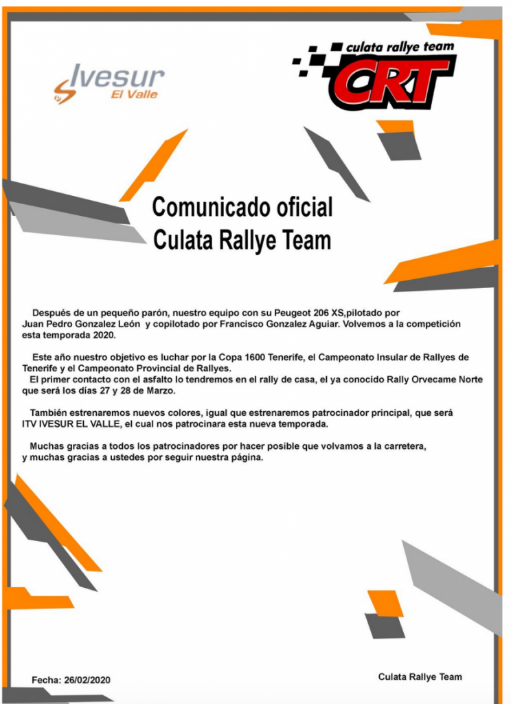 El equipo tinerfeño Culata Rallye Team, compuesto por Juan Pedro González y Francisco González, presentará en sociedad los nuevos colores de su Peugeot 206 XS.