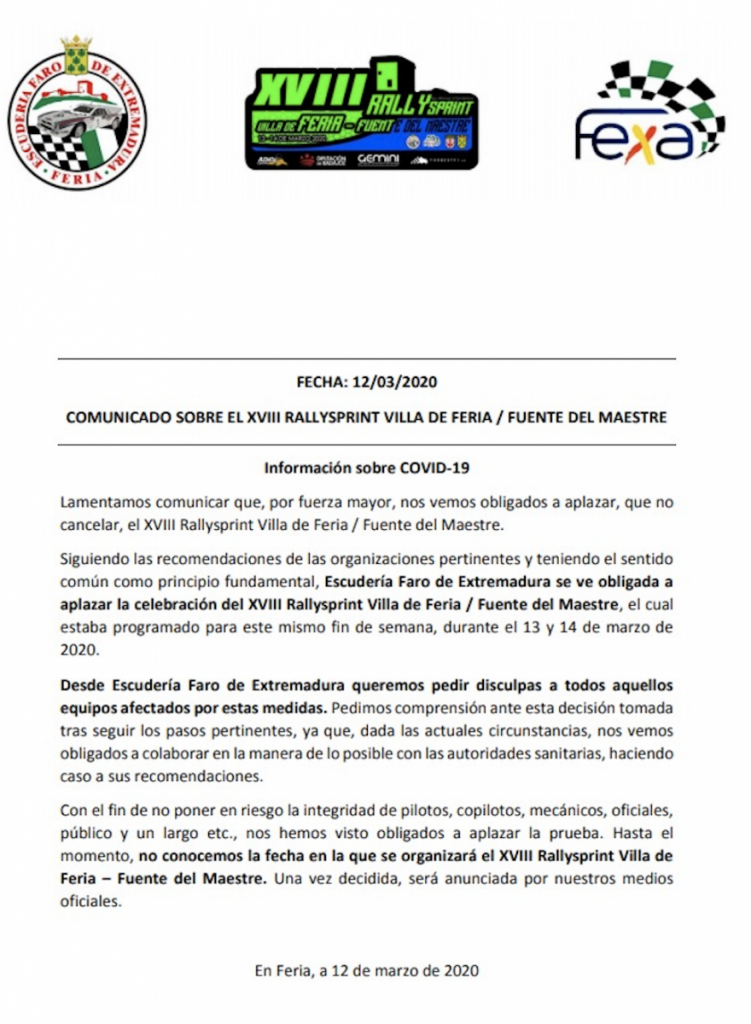 Desafortunadamente, las circunstancias derivadas del COVID-19 y las recomendaciones sanitarias, obligan definitivamente a aplazar el Rallysprint Feria – Fuente del Maestre, previsto para este viernes 14 y el sabado 14.