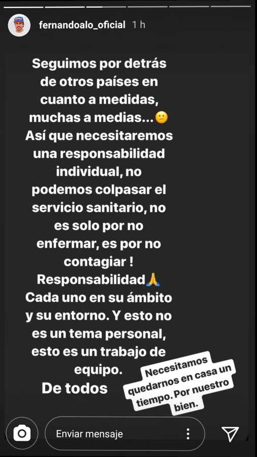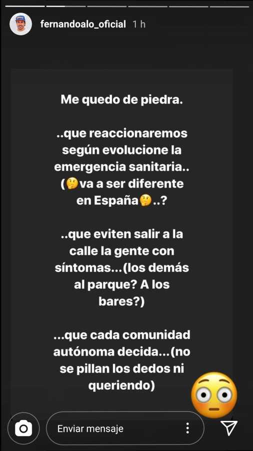 “Me quedo de piedra. Que reaccionaremos según evolucione la emergencia sanitaria. ¿Va a ser diferente en España? Que evite salir a la calle la gente con síntomas. ¿Y los demás qué? ¿Al parque o los bares? Que cada Comunidad Autónoma decida. No se pillan los dedos ni queriendo”, escribió Alonso en su perfil de Instagram.