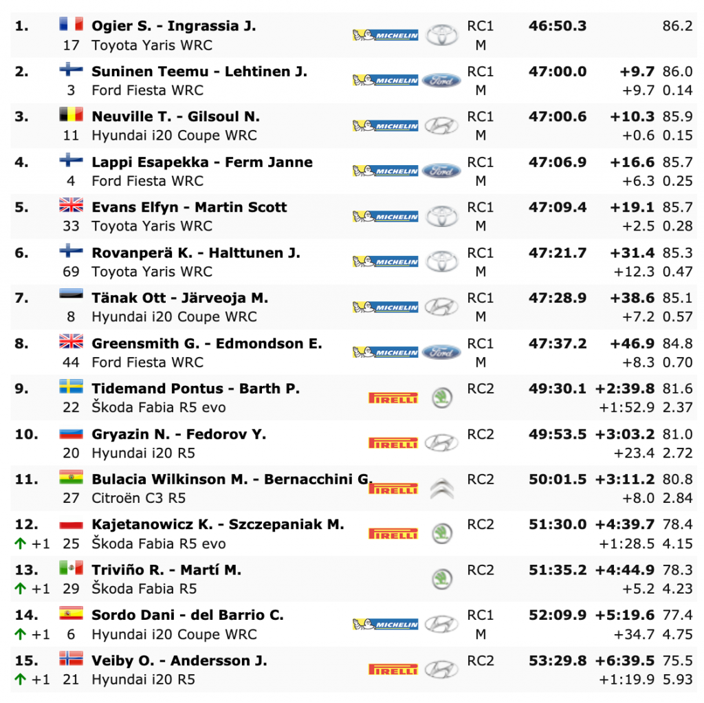 Hasta cuatro scratch diferentes se han logrado en las cuatro especiales celebradas, siendo Tanak, Ogier, Sordo y Neuville los que lograron marcar la pauta, pero en la parada del medio día los galos de Toyota han podido terminar como primeros, aunque la distancia es irrelevante visto lo visto.