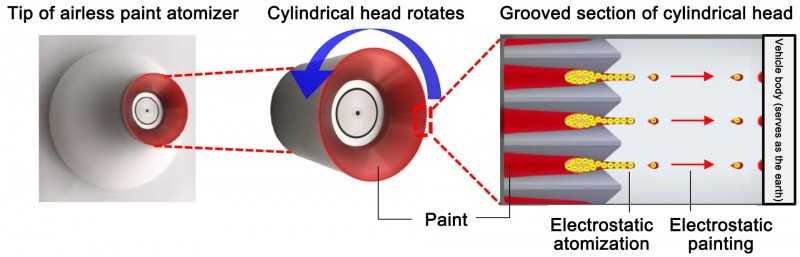 El pulverizador de pintura de aire convencional pulveriza pintura mediante la fuerza aerodinámica y la carrocería del vehículo se pinta con las partículas atomizadas. Por este motivo, las partículas de pintura se dispersan cuando el aire rebota en la carrocería, lo que da lugar a una eficiencia de revestimiento en torno al 60 o 70%. En comparación, el nuevo pulverizador sin aire emplea electricidad para pulverizar la pintura (atomización electrostática) y las partículas con carga estática gravitan hacia la carrocería del vehículo, adhiriéndose a ella (pintado electrostático). Las tecnologías de pulverización electrostática y pintado electrostático reducen notablemente el número de partículas atomizadas que se dispersan, con lo que se consigue una eficiencia de revestimiento superior.