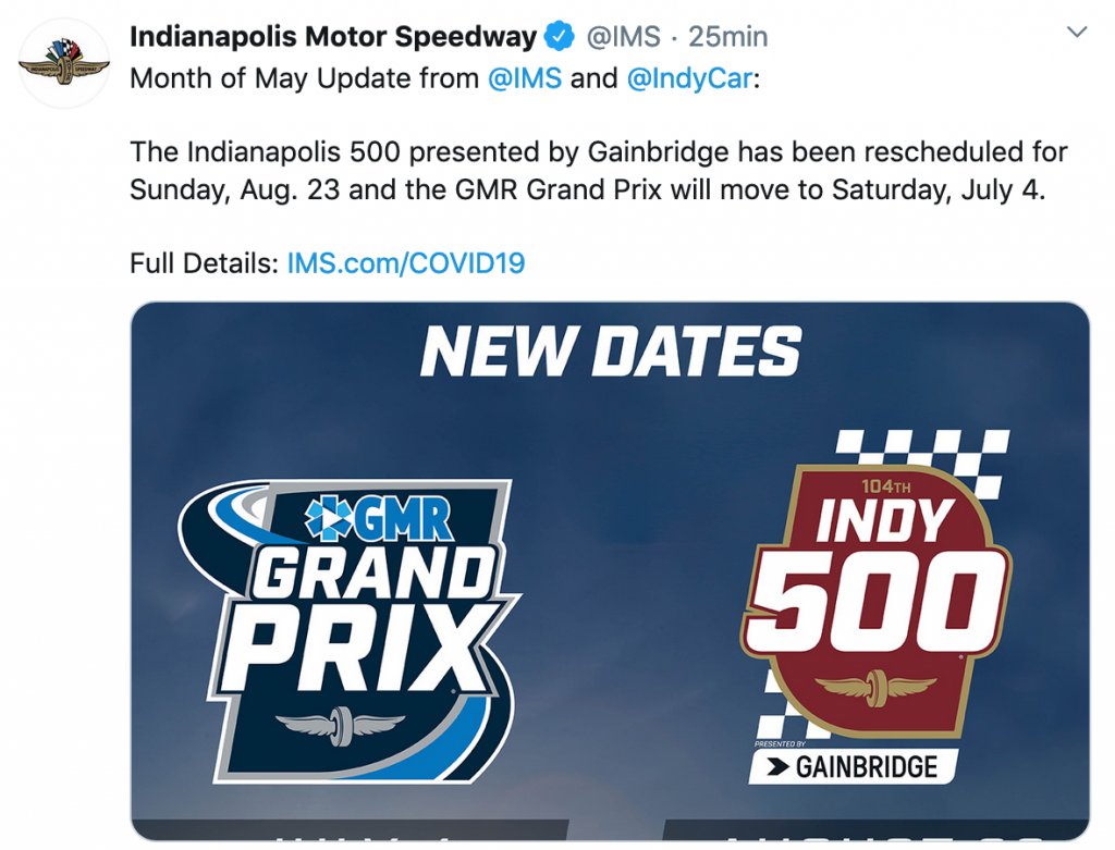 El popular trazado norteamericano ha confirmado que la mítica carrera de la IndyCar pasará a disputarse el próximo 23 de agosto, esperando que en esas fechas la crisis del coronavirus esté controlada y se permita competir.
