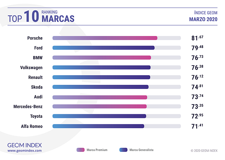 La sexta plaza fue para Skoda con 74.81 puntos, justo por delante de Audi con 73.74, que completó el podio de las marcas premium. En la octava posición se situó Mercedes-Benz con 73.35 puntos, mientras que Toyota con 72.95 puntos y Alfa Romeo con 71.41 completaron el ‘top ten’ del mes de marzo.