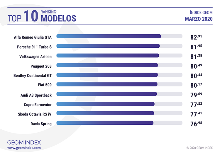 Marzo, en el apartado de modelos, fue un mes dominado por los modelos o versiones más deportivas de los fabricantes. El líder indiscutible fue el Alfa Romeo GTA, que se coronó como el más valorado por los internautas españoles con 82.91 puntos en el índice GEOM. Los internautas han celebrado, especialmente, el hecho de que la firma transalpina recupere las míticas siglas GTA en su gama.