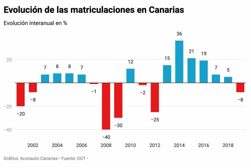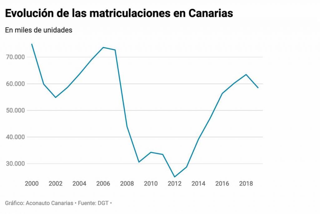 El año siguiente, 2009, las matriculaciones cayeron otro 30%. Entre 2007 y 2013, la comercialización de automóviles en Canarias retrocedió un 61%, según los datos a los que ha tenido acceso Aconauto: de 73.640 unidades a apenas 25.047. El ejercicio 2019 se cerró con 63.467 matriculaciones.