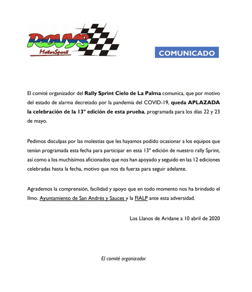El Comité Organizador del Rally Sprint Cielo de La Palma ha comunicado sobre el aplazamiento de edición 2020 de la cita palmera.