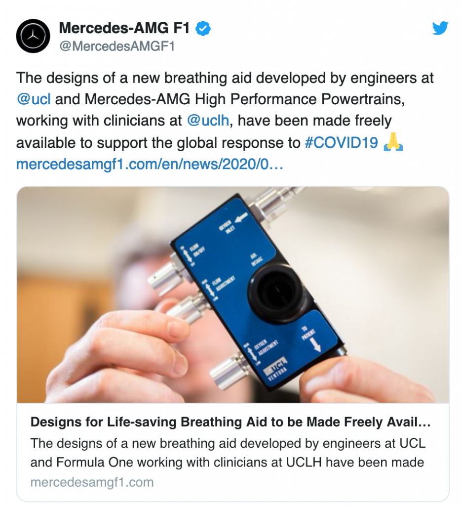 En colaboración con el University College de Londres y el Servicio Británico de Salud, los trabajdores de la fábrica de Brixworth, donde se crean los motores del equipo de Fórmula 1, empezaron un trabajo de ingeniería inversa sobre los modelos Mark I de respiradores que se usaban normalmente.