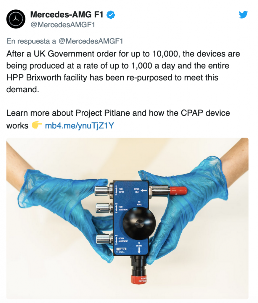 La escudería germana ha puesto una de sus siete fábricas, la situada en Inglaterra, a trabajar para luchar contra el coronavirus, en el llamado ‘Proyecto Pit Lane’. Los hexacampeones del mundo de Fórmula 1 ha trabajado en la construcción de respiradores para la sanidad británica, que como muchos otros países, está desbordada ante la pandemia, y en apenas 10 días han conseguido la friolera de 10.000 CPAP, o dispositivos de respiración positiva continua.