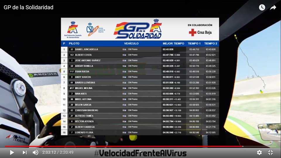 Tras una emocionante carrera, Dani Juncadella logró la victoria en el Gran Premio Solidaridad, evento organizado por la Real Federación Española de Automovilismo, de la mano de Cruz Roja, con la campaña #VelocidadFrenteAlVirus, que se cerró con una carrera virtual benéfica con grandes pilotos de nuestro país y donde todo lo que se recaude será destinado a la compra de equipamiento básico de protección para el personal sanitario.