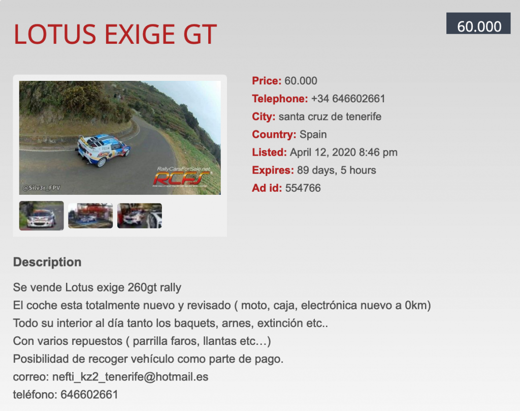 El piloto tinerfeño Neftalí Martín ha puesto su Lotus Exige RGT a la venta.