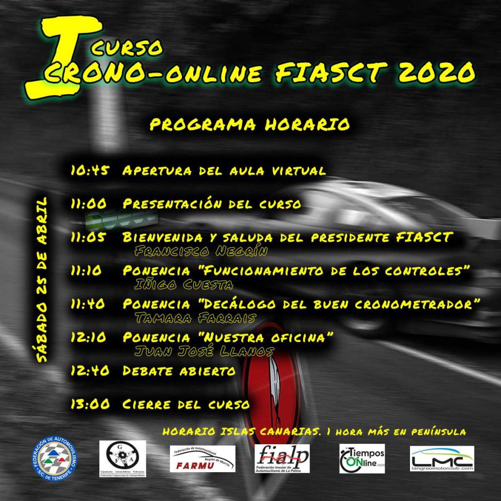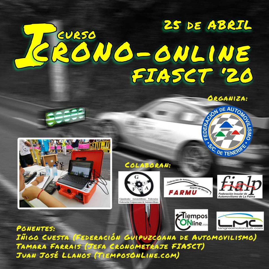El pasado jueves 16 de abril se convocaba el I Curso Crono-Online FIASCT 2020, una iniciativa inédita y pionera en nuestro país, promovida por la Federación Interinsular de Automovilismo de Tenerife y la empresa de cronometraje TiemposOnLine.com.