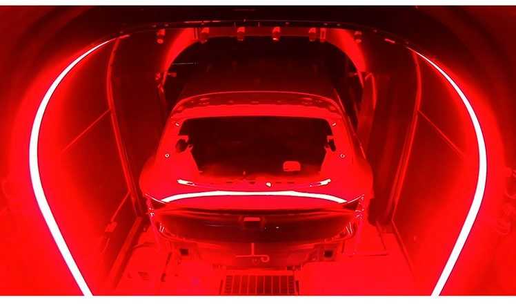 Cromoterapia antimpurezas. Es el último de los tratamientos, el que comprueba que todos los demás han funcionado a la perfección. Bajo una luz rojiza, el vehículo se desliza a través del scanner. Son 43 segundos durante los que se sacan nada más y nada menos que 50.568 fotografías. Hay 28 cámaras que capturan 42 imágenes por segundo. Todo para revisar al milímetro la carrocería y comprobar que no hay ninguna impureza o imperfección. Tras pasar por el spa de los coches, éstos están listos para salir a rodar con su mejor color.