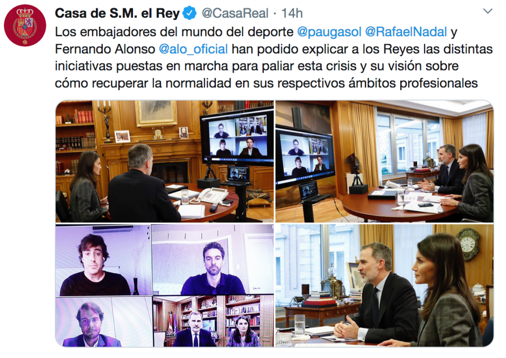 Se trata de una iniciativa del FMRE para movilizar a las administraciones públicas, al sector privado y a la sociedad civil. Diferentes embajadores, tanto del mundo deportivo como del mundo sociocultural y científico, han compartido con los Reyes su visión sobre el impacto del coronavirus en sus actividades.