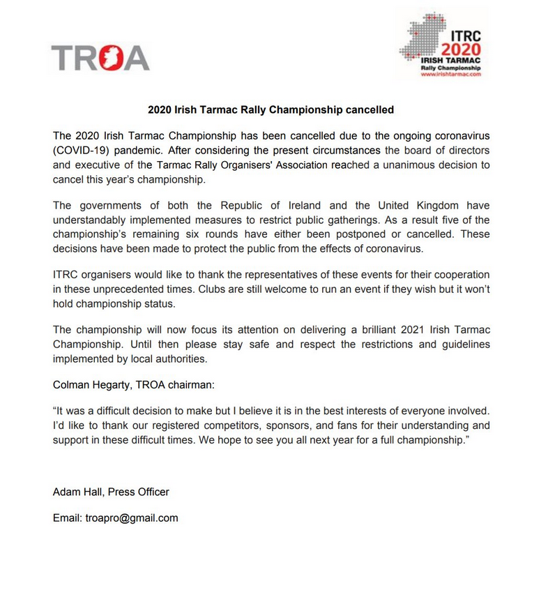 El Campeonato de rallys irlandés de asfalto 2020 ha sido cancelado debido a la pandemia de coronavirus.