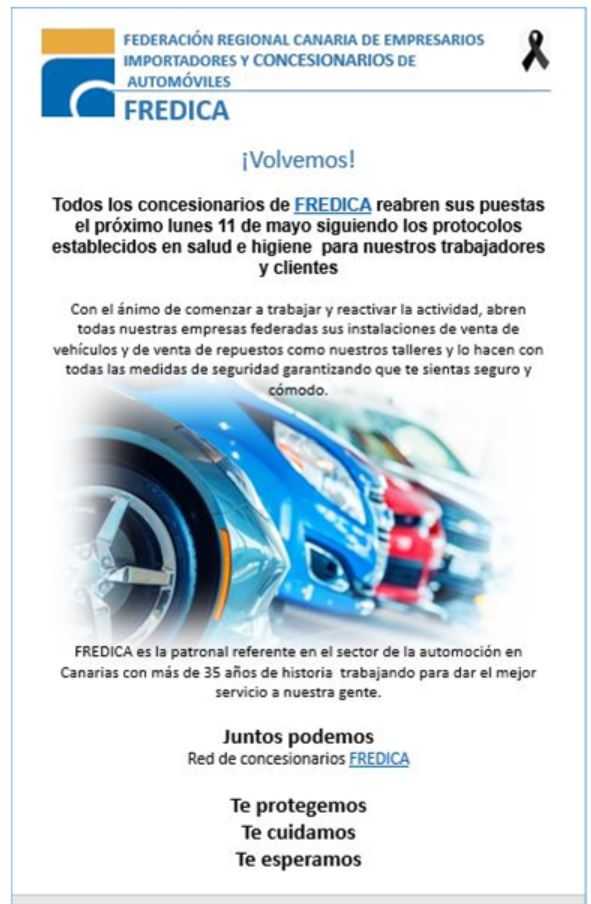 Los concesionarios miembros de FREDICA comenzarán con la reapertura de sus establecimientos este lunes 11 de mayo, después de la que la Orden 399/2020 publicada este sábado, día 9 de mayo, permita expresamente la apertura de los concesionarios, eso sí, con cita previa.