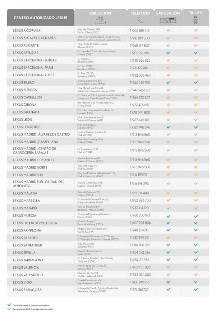 A través del siguiente link, cualquier cliente podrá consultar la situación de su Centro Autorizado Lexus más cercano, así como si está abierto o no: www.lexusauto.es/concesionarios-lexus-disponibles