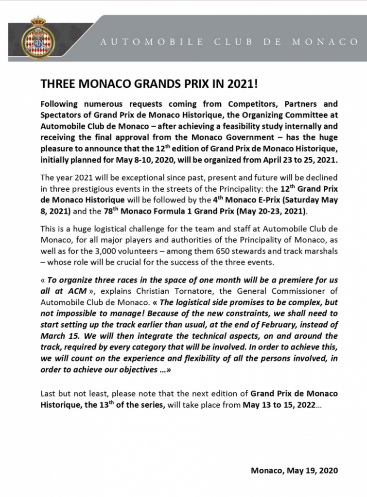 “En 2021, pasado, presente y futuro se unirán con tres prestigiosos eventos en las calles del Principado: a la 12ª edición del Gran Premio de Mónaco histórico, el cuarto ePrix de Mónaco el 8 de mayo y la 78ª edición del Gran Premio de Mónaco los días 20, 22 y 23 de mayo”, expresó el organizador a través de un comunicado.