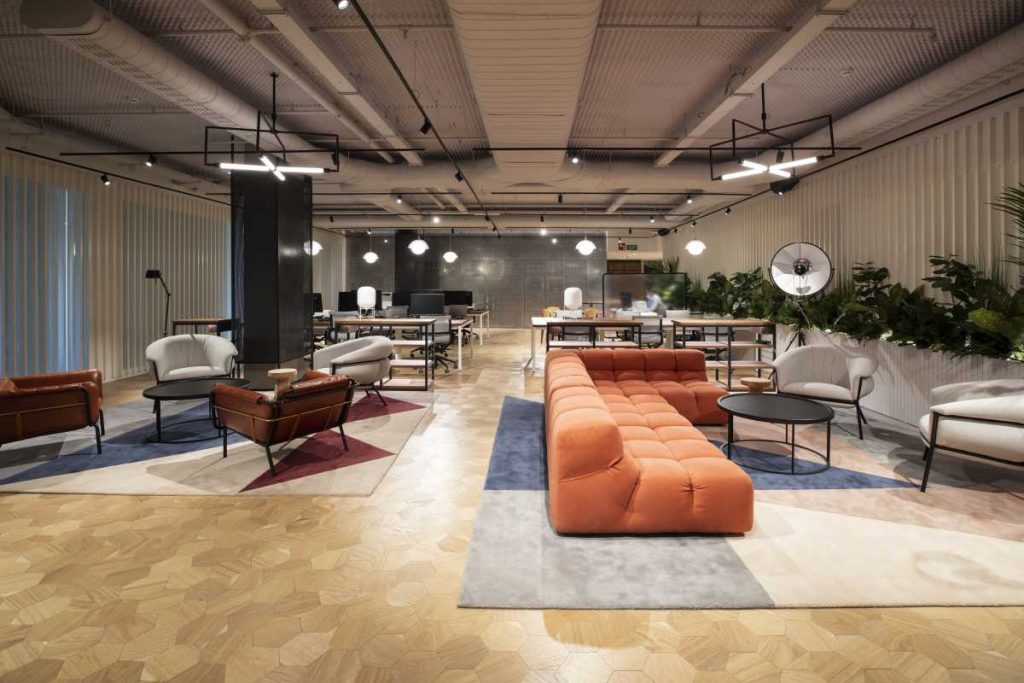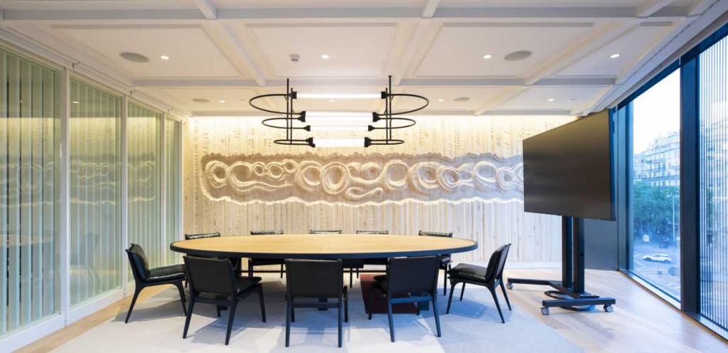 Cabe destacar que la verdadera gran protagonista del espacio es la luz. Destacando, por un lado, la luz de Barcelona, filtrada a través de la gran fachada acristalada, equipada con un sistema motorizado de persianas que hace de CASA SEAT un edificio sostenible al reducir las necesidades de climatización y, por otro, la luz interior. Ésta ha sido cuidadosamente trabajada en baños indirectos a través de lámparas de diseño y anticuario para crear una atmósfera cálida y acogedora. Esta luz, la de Barcelona y la propia del espacio conviven con elementos singulares como los taburetes con muelles y/o los murales – ya sean decorativos o relacionados de alguna manera con la mecánica y el movimiento – creando una conexión entre el espacio y el sector del automóvil.