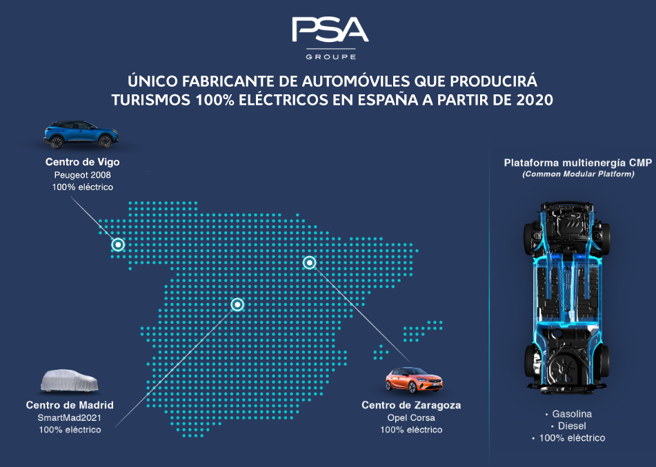 - España es un país clave en la estrategia de Groupe PSA frente a las emisiones de CO2, tanto en el plano comercial como en el industrial: es el único fabricante que producirá, a partir de este año, turismos 100% eléctricos en sus 3 fábricas españolas, que son un referente en materia de política ambiental.