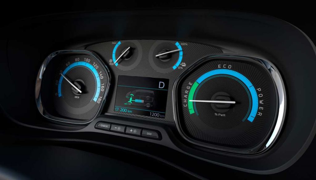 – Un cuadro de instrumentos analógico con una gama de colores adaptada a la movilidad eléctrica.