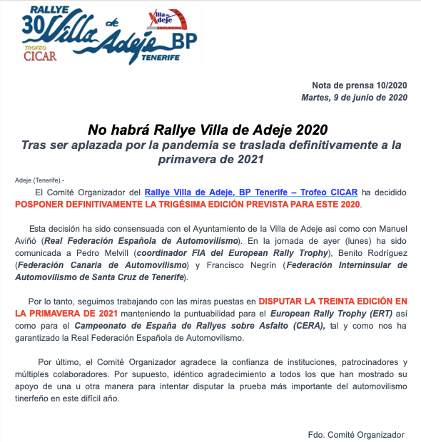 La Escuderia Villa de Adeje ha publicado un comunicado en redes sociales donde explican que «este pasado martes comunicábamos que definitivamente este año no podremos disfrutar de la 30 Edición del Rally Villa de Adeje BP Tenerife Trofeo Cicar».