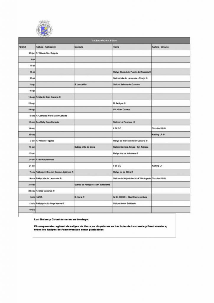 Como ya adelantamos el pasado sábado, las pruebas de circuito y slaloms se disputarán los domingos en lugar del sábado y todo el campeonato regional y provincial de rallys de tierra se desarrollará en las islas de Fuerteventura (todos sus rallys) y Lanzarote (Rallye Isla de los Volcanes-CERT). Todavía existen algunas coincidencias durante el mismo fin de semana de pruebas de especialidades diferentes,aunque en la manera que sea posible se ajustarán mejor en el nuevo Calendario FALP.