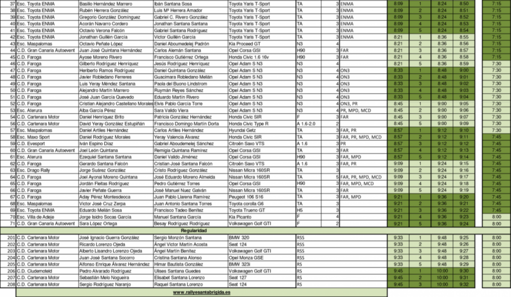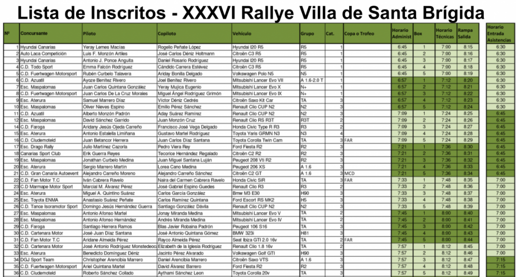 Para animar la parte alta, también se han apuntado a este XXXVI Rallye Villa de Santa Brígida equipos como los formados por Samuel Marrero-Víctor Déniz (Citroën Saxo Kit Car), Miguel Quintino-Carlos García (BMW M3), Antonio Estalella-Gustavo Martel (Toyota Yaris), así como los Renault Clio Cup N2 de Oliver Nieves-Emilio Pérez, Alberto Monzón-Aday Suárez y Domingo Hernández-Santiago González.