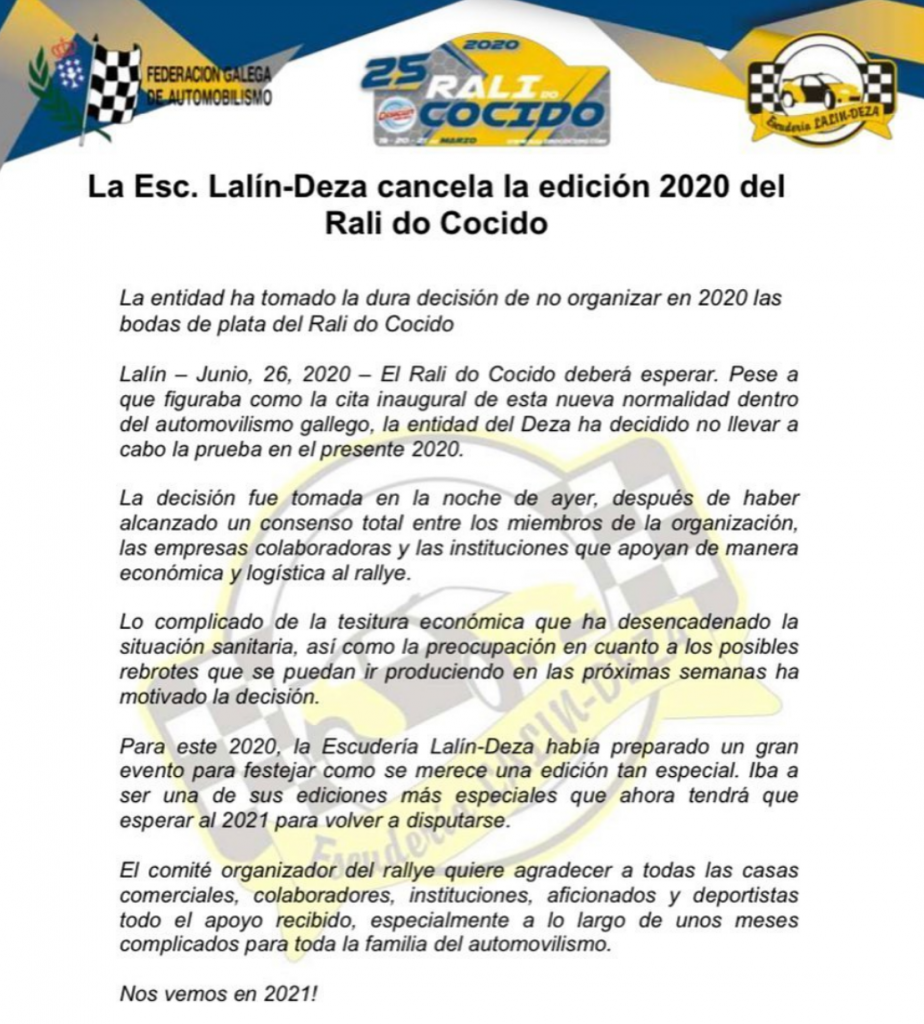 Se suspende la vigésimo quinta edición del Rali do Cocido Por Rafa León En 26/06/2020 17:23 Compartir FacebookTwitterWhatsAppEmailTelegramLinkedin Los organizadores de la vigésimo quinta edición del Rali do Cocido, cita del Campeonato de Galicia de Rallys, se han visto obligados a suspender la cita de este 2020, pensando ya en la de 2021. ralidococido Desafortunadamente, este año no podremos llevar a cabo la vigésimo quinta edición del Rali do Cocido. Nos ponemos a trabajar ya con más ganas que nunca para regresar con toda la fuerza posible en 2021!! Campeonato de Galicia de RallysEspañaEuropaGaliciaRali Do Cocido Compartir