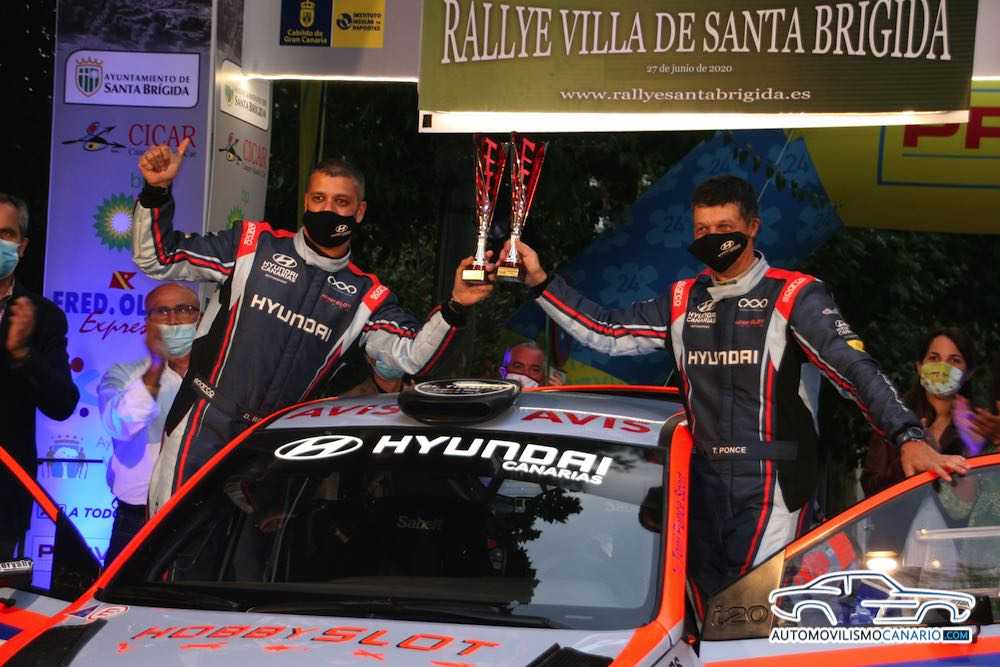 Los grancanarios Toñi Ponce y Dani de Rosario (Hyundai i20 R5) terminaron terceros del Rally Villa de Santa Brígida, y todo a pesar de un fuerte golpe en un cambio de rasante, lo que le produjo una contractura al piloto: “Dani me cantó un rasante a fondo, porque yo lo había anotado así, y no era así, por lo que hemos caído de cabeza y el golpe fuerte. Tendré que ir al hospital para que me vean porque los dos nos quedamos impresionados. Lo hemos pasado mal, pero al final te quedas satisfecho con el rendimiento del coche, que se ha comportado a las mil maravillas. Sabemos nos espera una temporada complicada, pero lo intentaremos”.