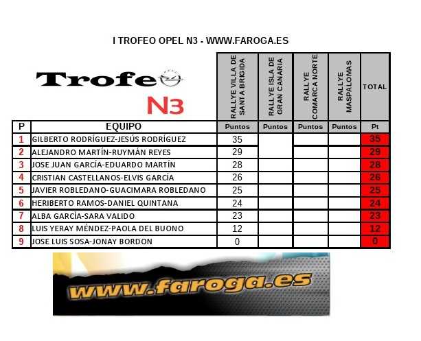 Comenzó una corta pero intensa temporada dentro del Trofeo Opel N3, con dominio total y absoluto de los hermanos Rodríguez, Gilberto y Jesús, que aventajaron en casi dos minutos a su más inmediato perseguidor, ganando todos y cada uno de los tramos disputados, sumando así 3 puntos extras al ganar el Tramo especial con puntuación extra.
