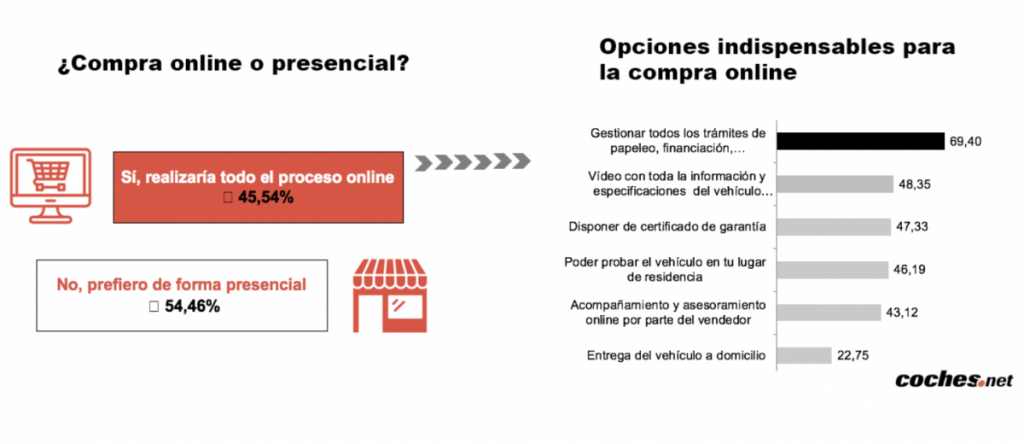 Entre quienes comprarían un vehículo, un 45,5% prefiere hacer todo el proceso de forma online. Sin embargo, para hacerlo de esta forma necesitaría ciertos requisitos que les dé seguridad y confianza como pueden ser que la gestión de todos los trámites sea fiable (para el 69,4% es indispensable), poder ver un video con toda la información y especificación del vehículo, disponer de un certificado de garantía o tener la opción de probar el vehículo en su lugar de residencia.
