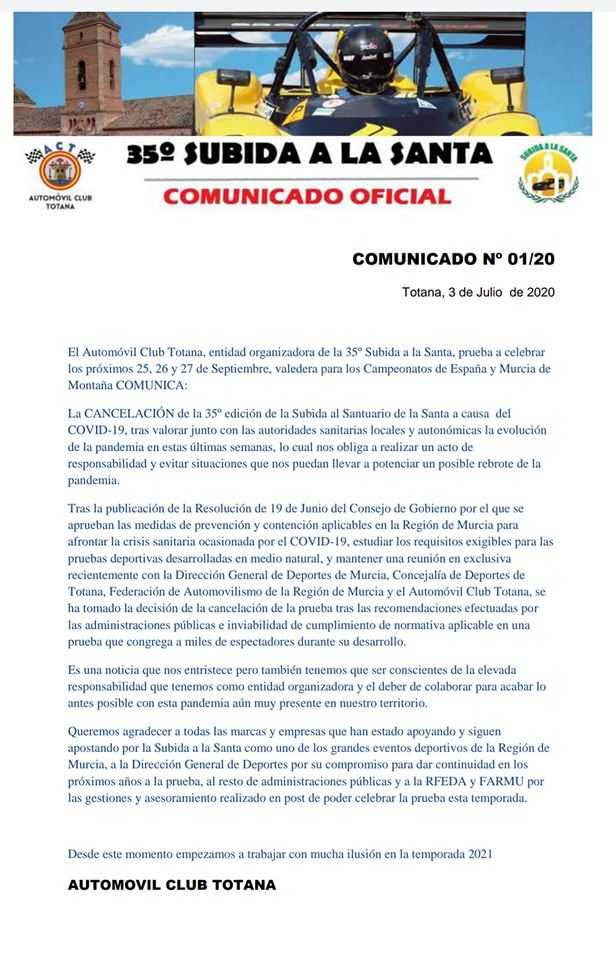 El Automóvil Club Totana, entidad organizadora de la 35 Subida a La Santa, prueba valedera para el Campeonato de España, confirma la cancelación de la cita a causa del Covid.