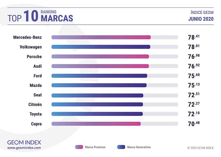 Volkswagen, que se quedó a menos de tres décimas del primer puesto del GEOM Index, con 78.01 puntos y fue además el mejor fabricante generalista del mes. El gran protagonista de su gama fue su modelo superior, el VW Arteon, que consiguió alzarse con la primera posición en el ranking de modelos. El podio de junio lo completó Porsche, que de esta manera no se baja de las posiciones de honor del índice de la consultora española, con 76.98 puntos. Muy cerca de las posiciones de honor y cerrando el podio entre las premium, se situó Audi con 76.92 puntos. La quinta plaza y la segunda entre los fabricantes generalistas fue para Ford, que acumuló una valoración de 75.60 puntos, mientras que Mazda sumó 75.13 puntos, sexta plaza general del ranking y tercera generalista.